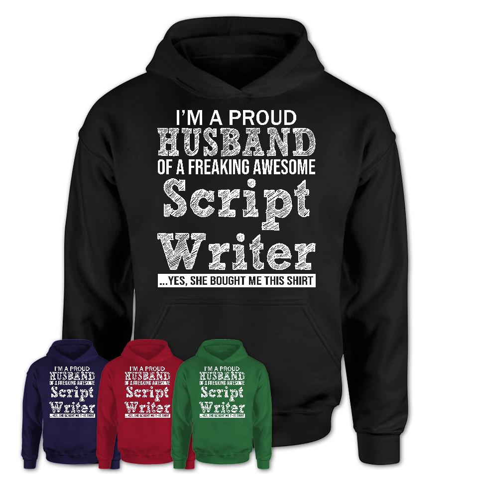 This awesome Script Writer shirt should not miss from your husband's wardrobe. It makes a proud gift for your husband on Valentine Day or Anniversary. This Script Writer shirt said "I'm A Proud Husband of A Freaking Awesome Script Writer". Also, it is an awesome birthday gift idea or a surprise Christmas gift for your husband.