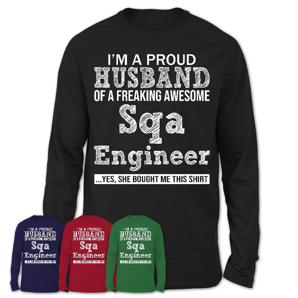 This awesome Sqa Engineer shirt should not miss from your husband's wardrobe. It makes a proud gift for your husband on Valentine Day or Anniversary. This Sqa Engineer shirt said "I'm A Proud Husband of A Freaking Awesome Sqa Engineer". Also, it is an awesome birthday gift idea or a surprise Christmas gift for your husband.
